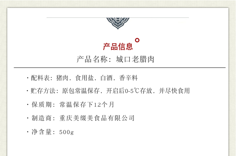 【品牌】巴渝印象腊肉500g